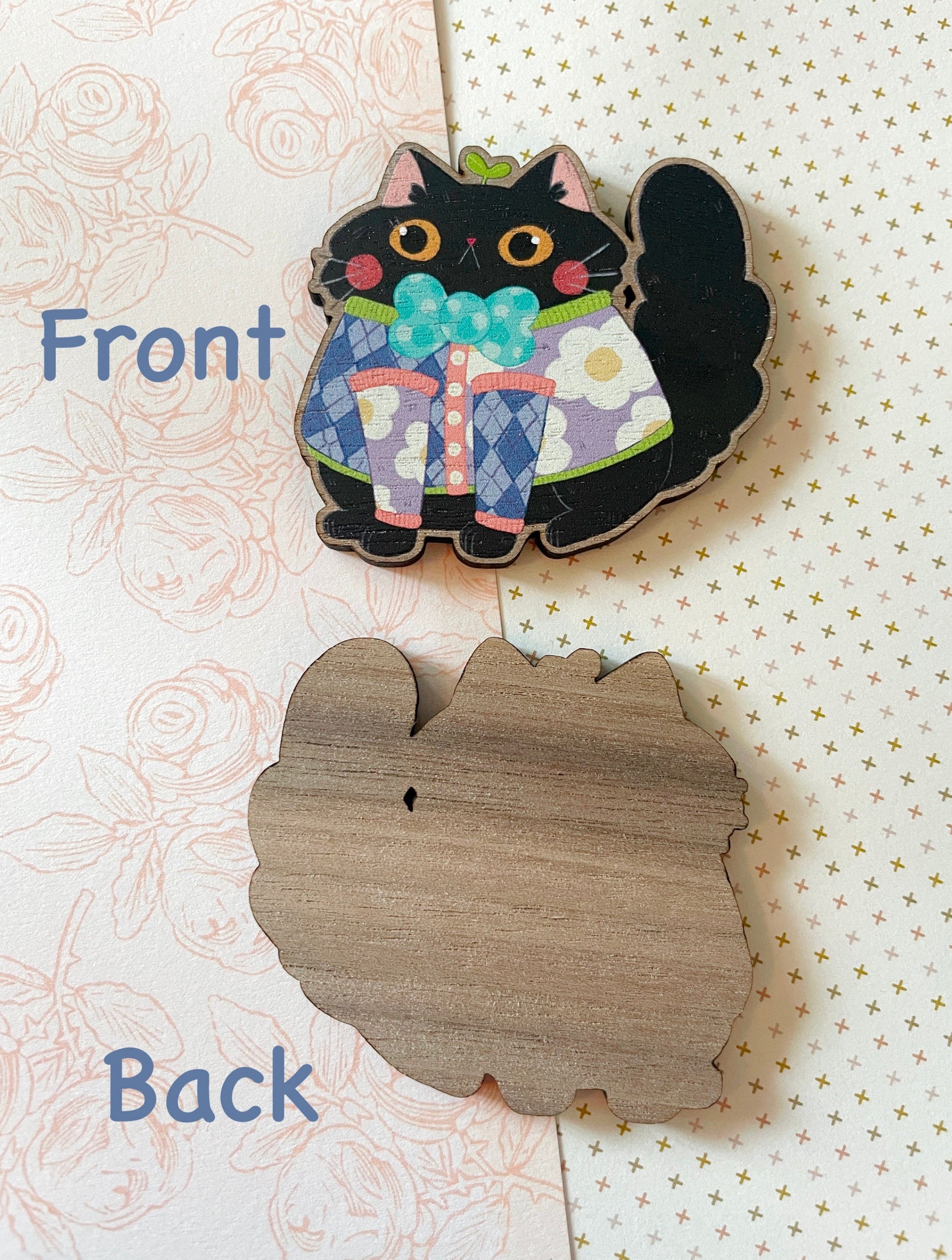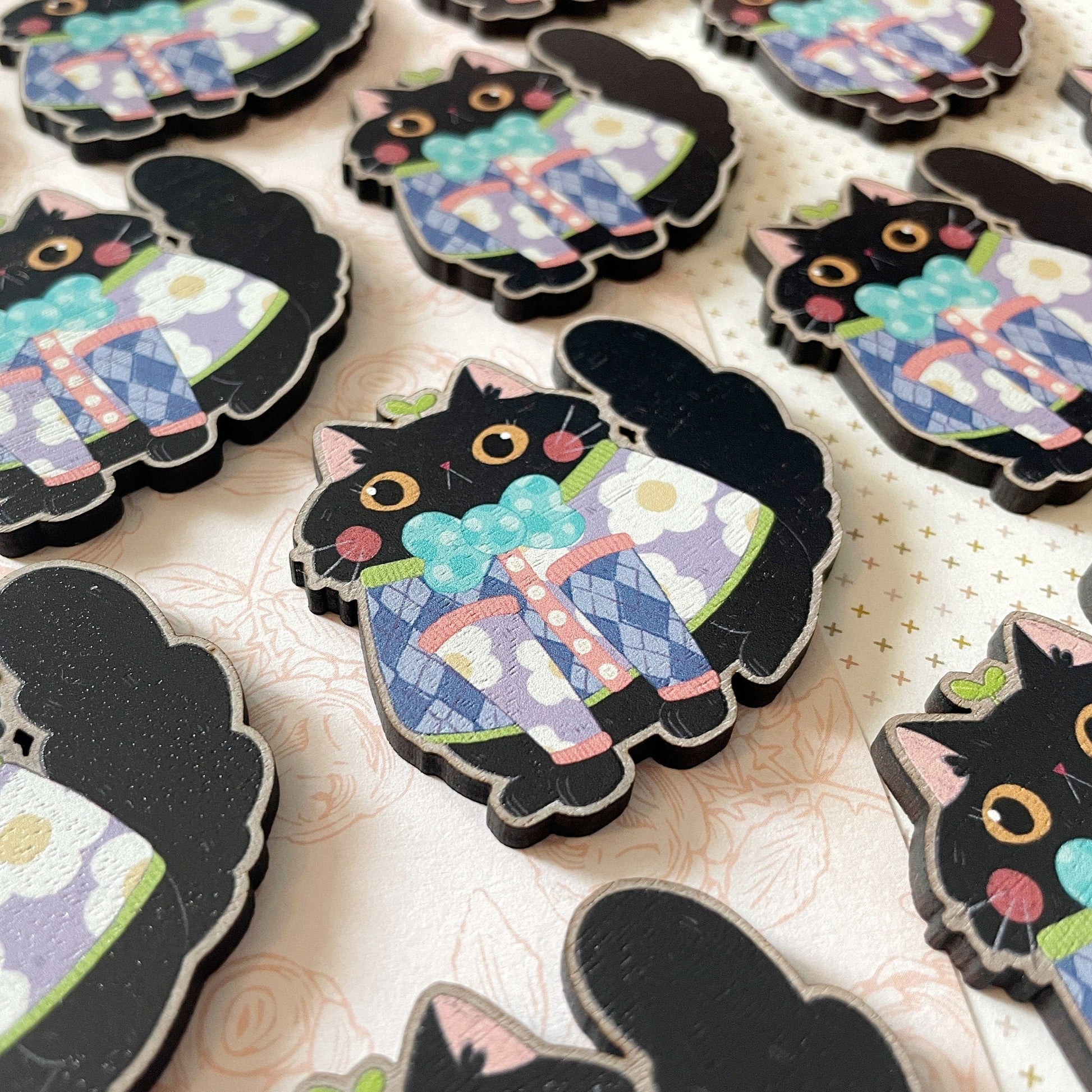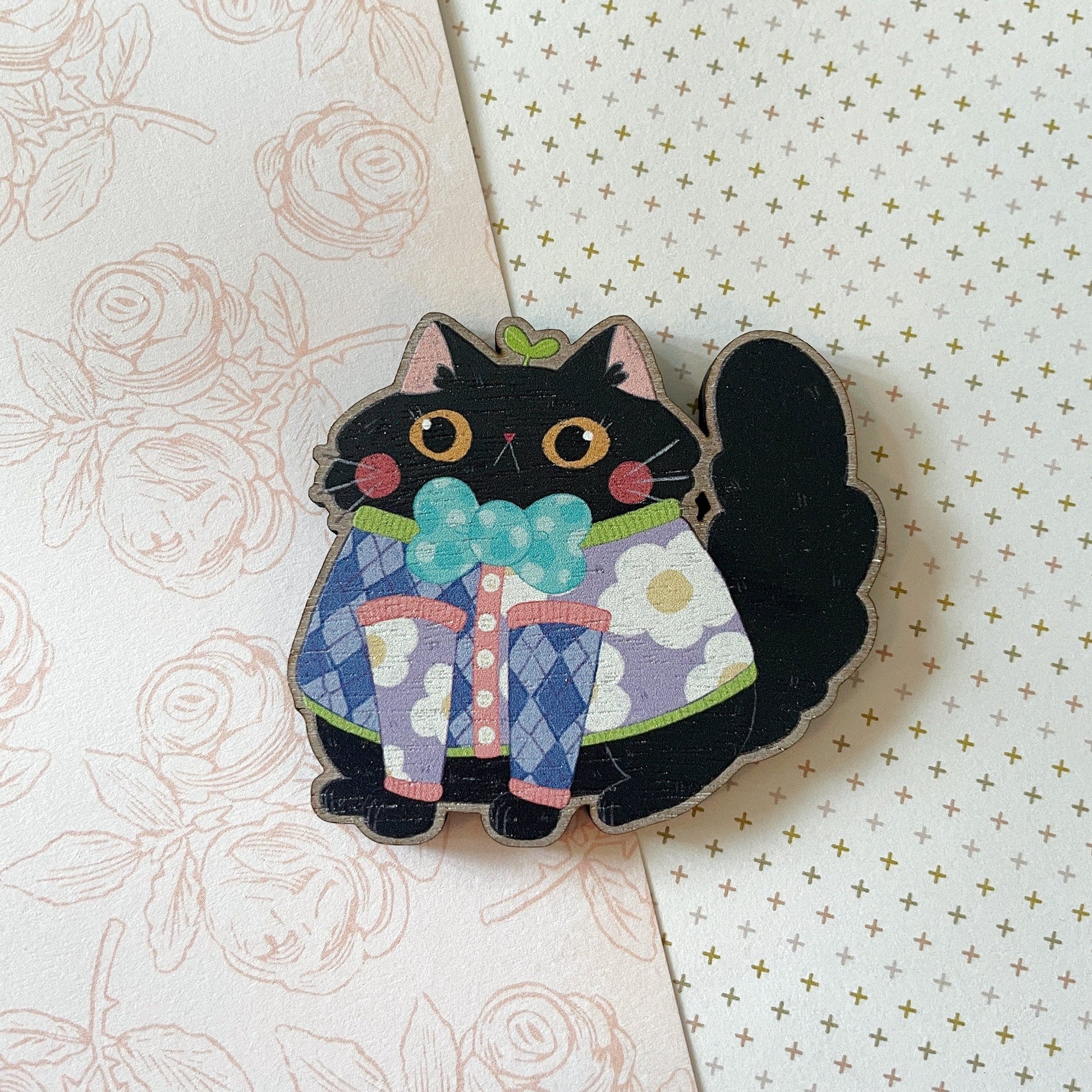 Black Fluffy Cat in Funky Sweater Wood Pin or Magnet