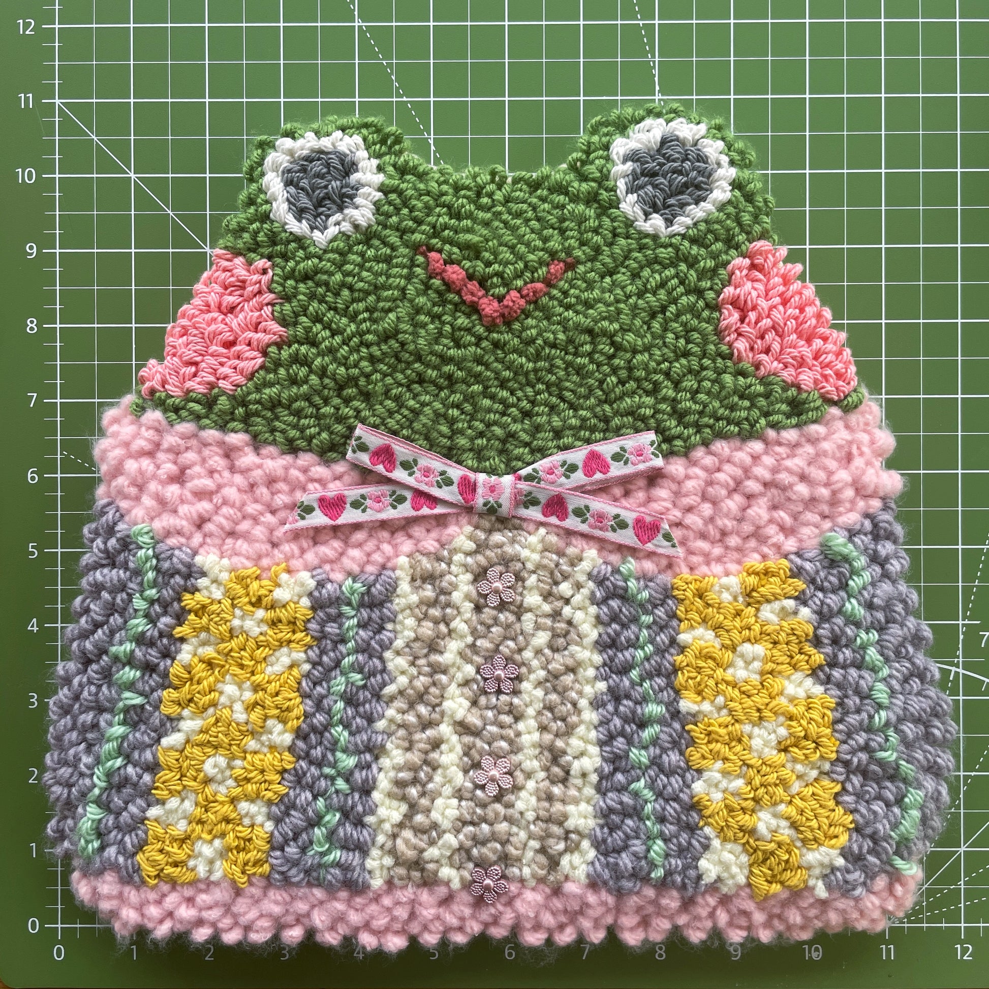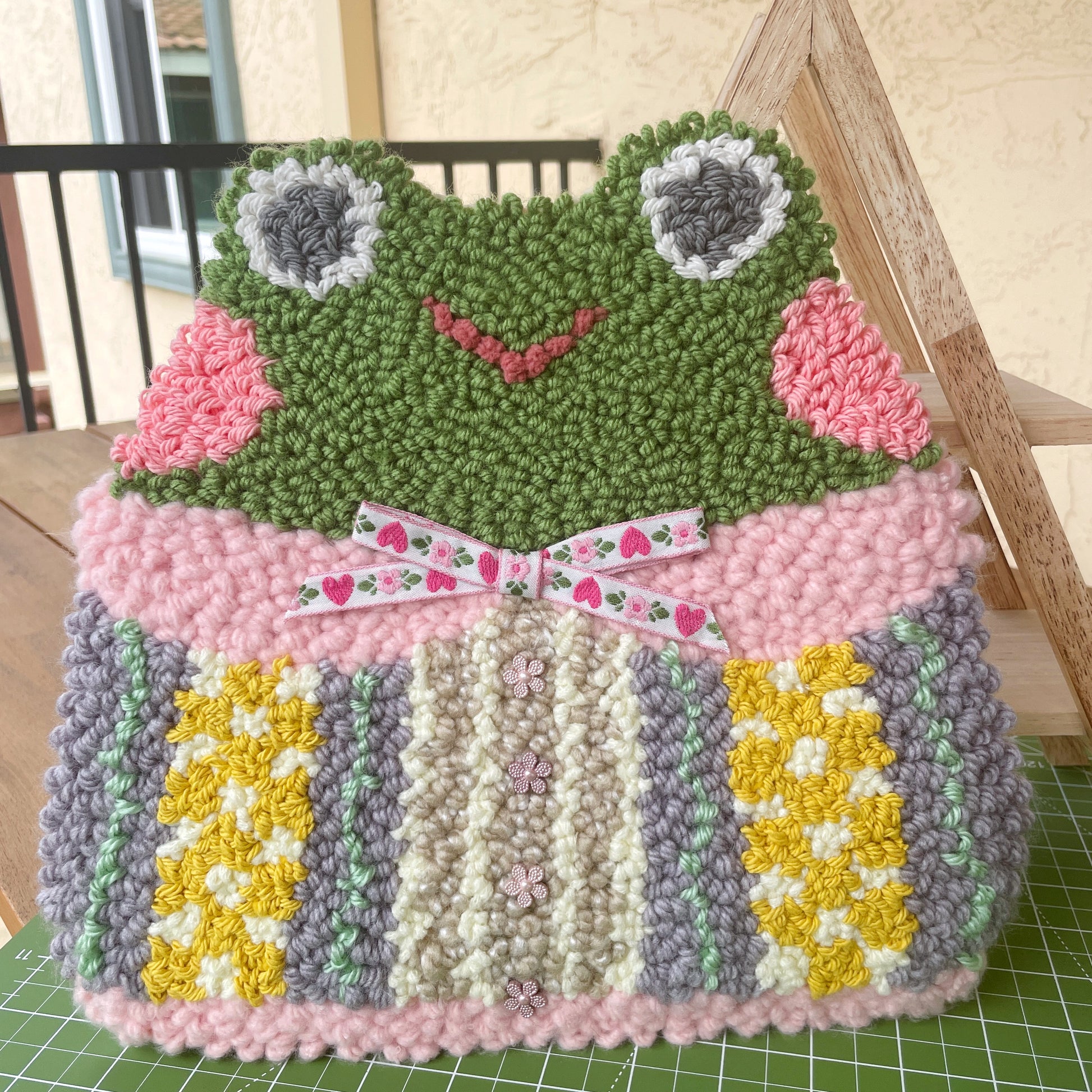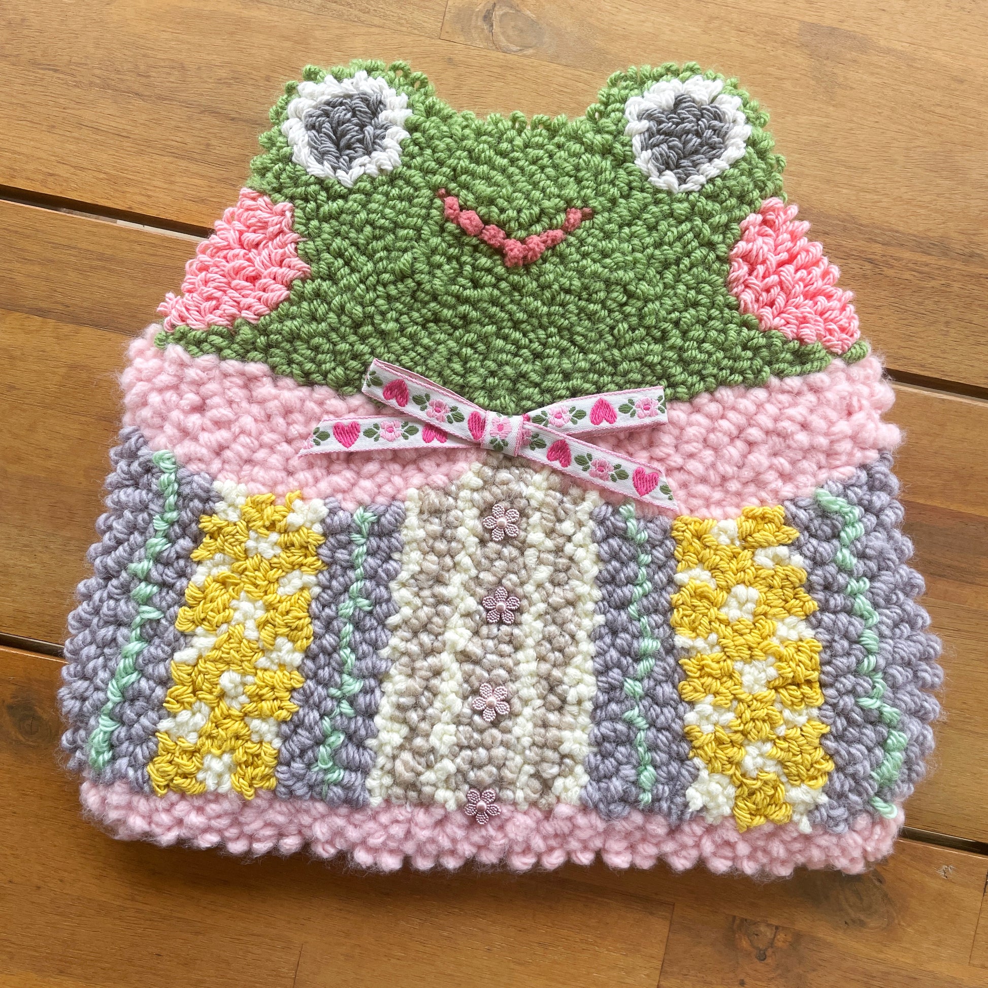 Frog with Pink Bow Large Punch Needle Wall Hang