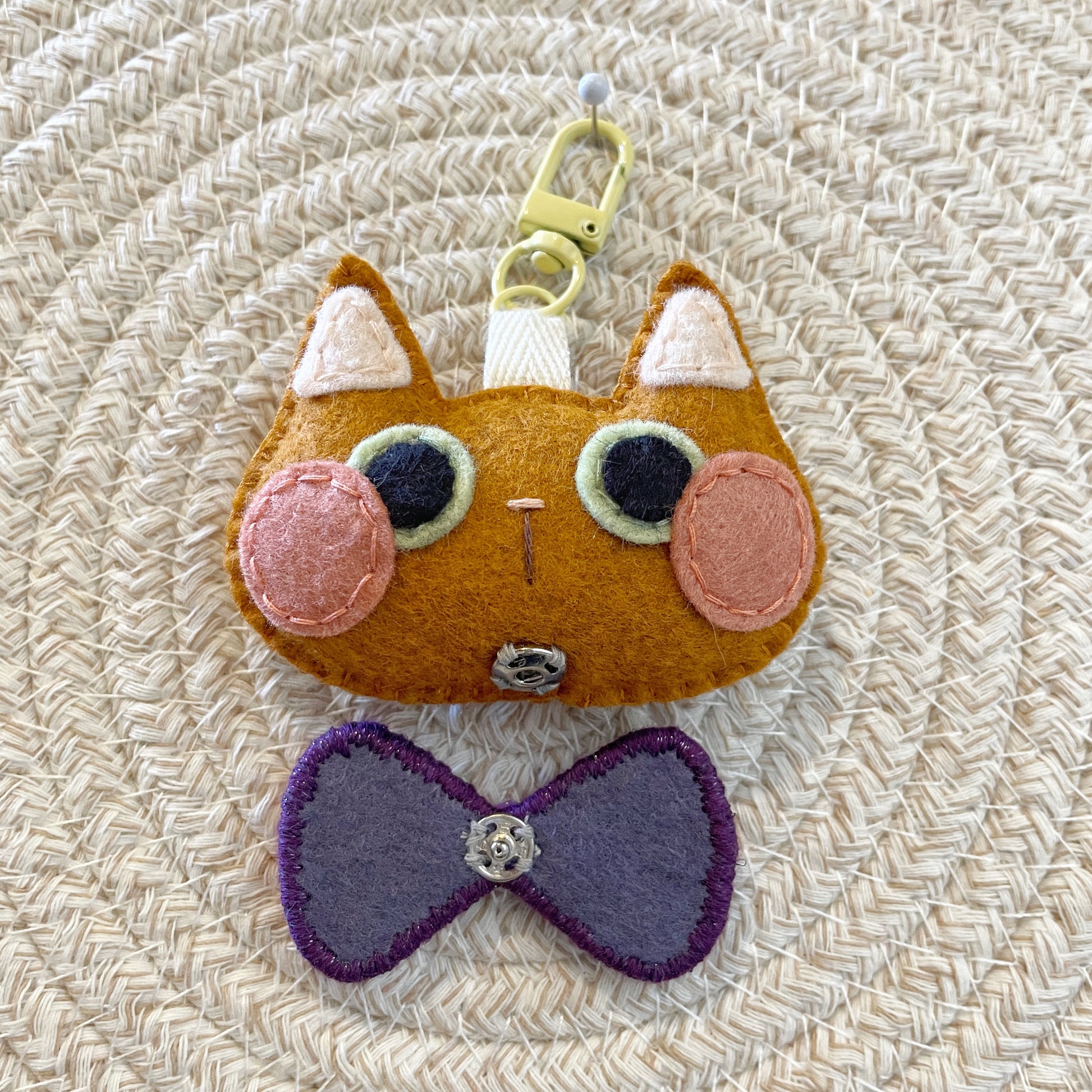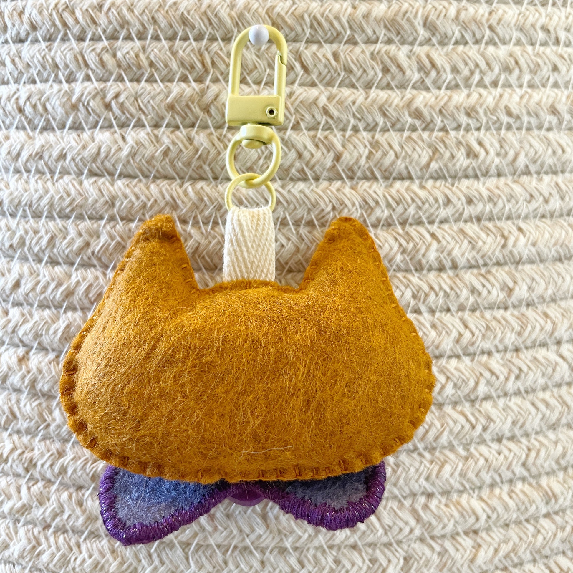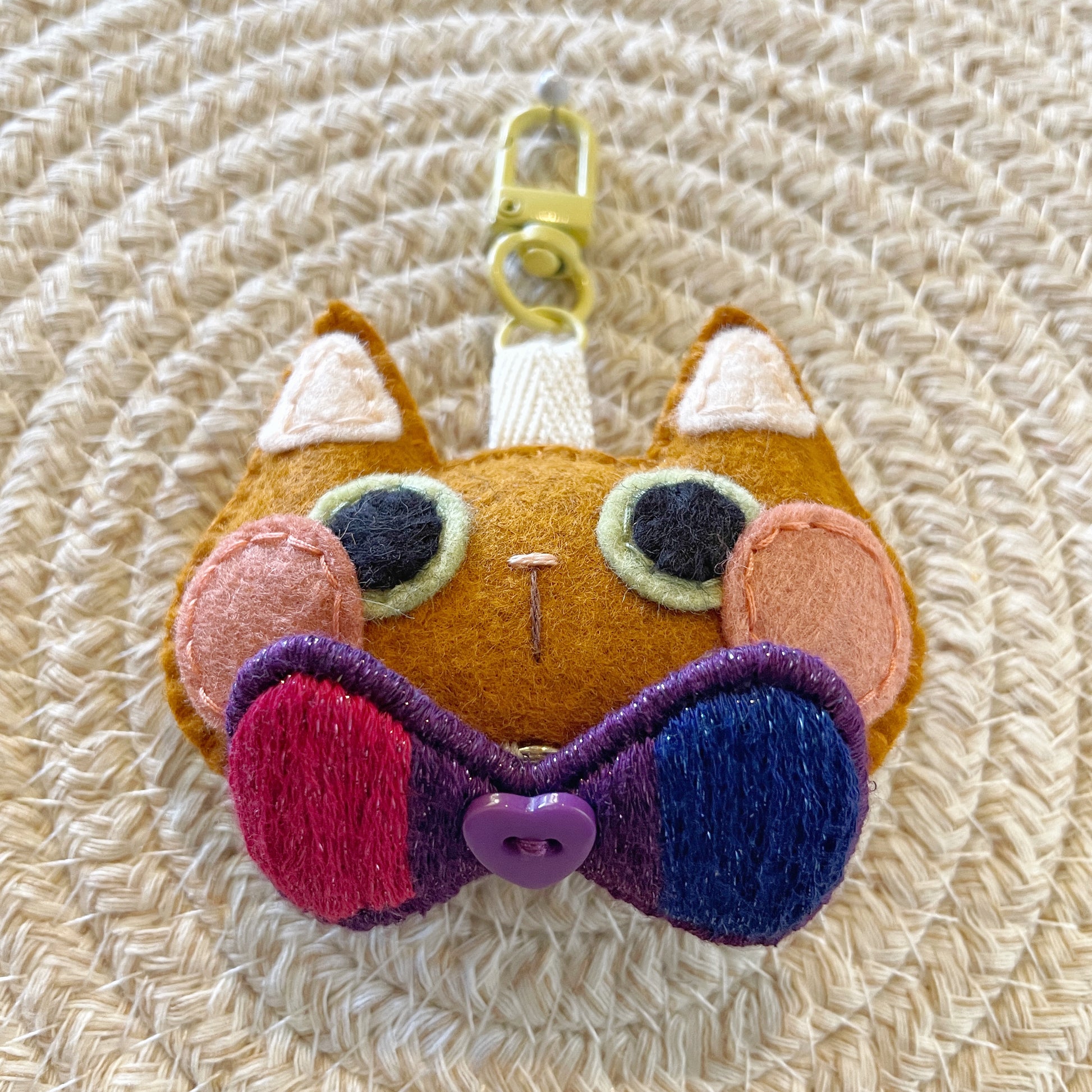 - Handmade felt plush keychain featuring a removable Pride flag themed bow-tie.