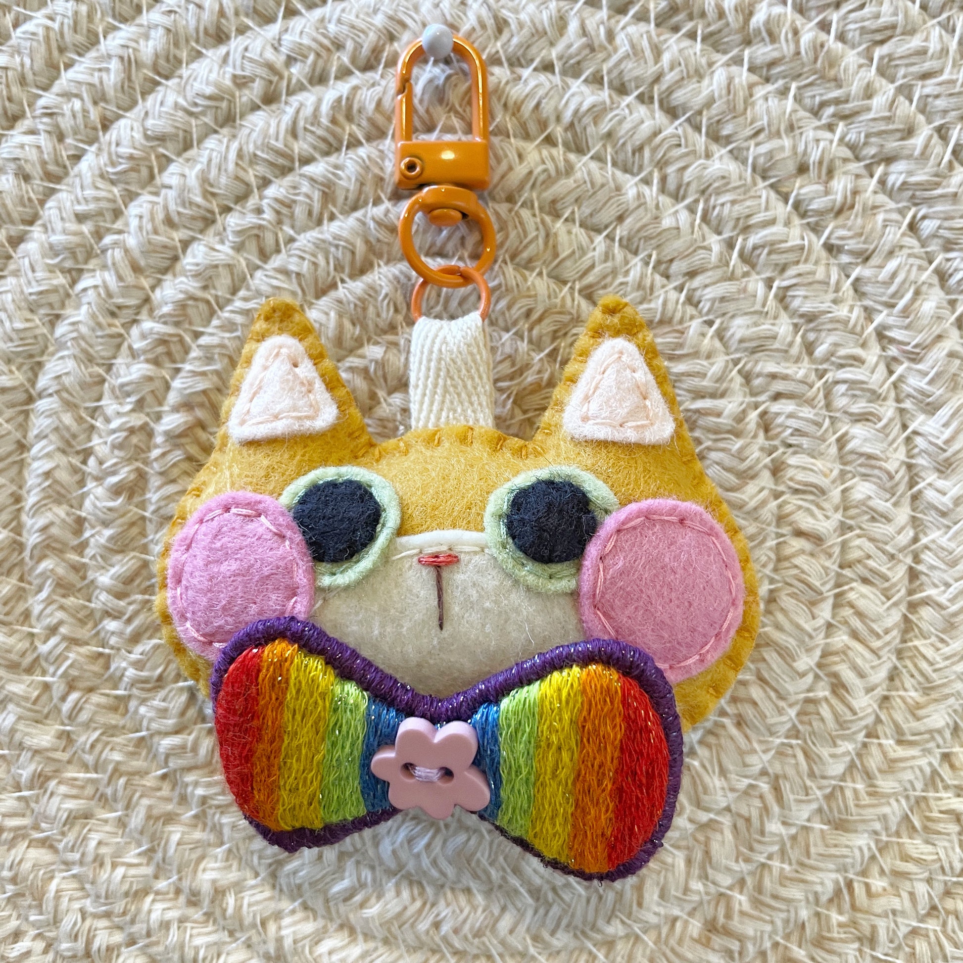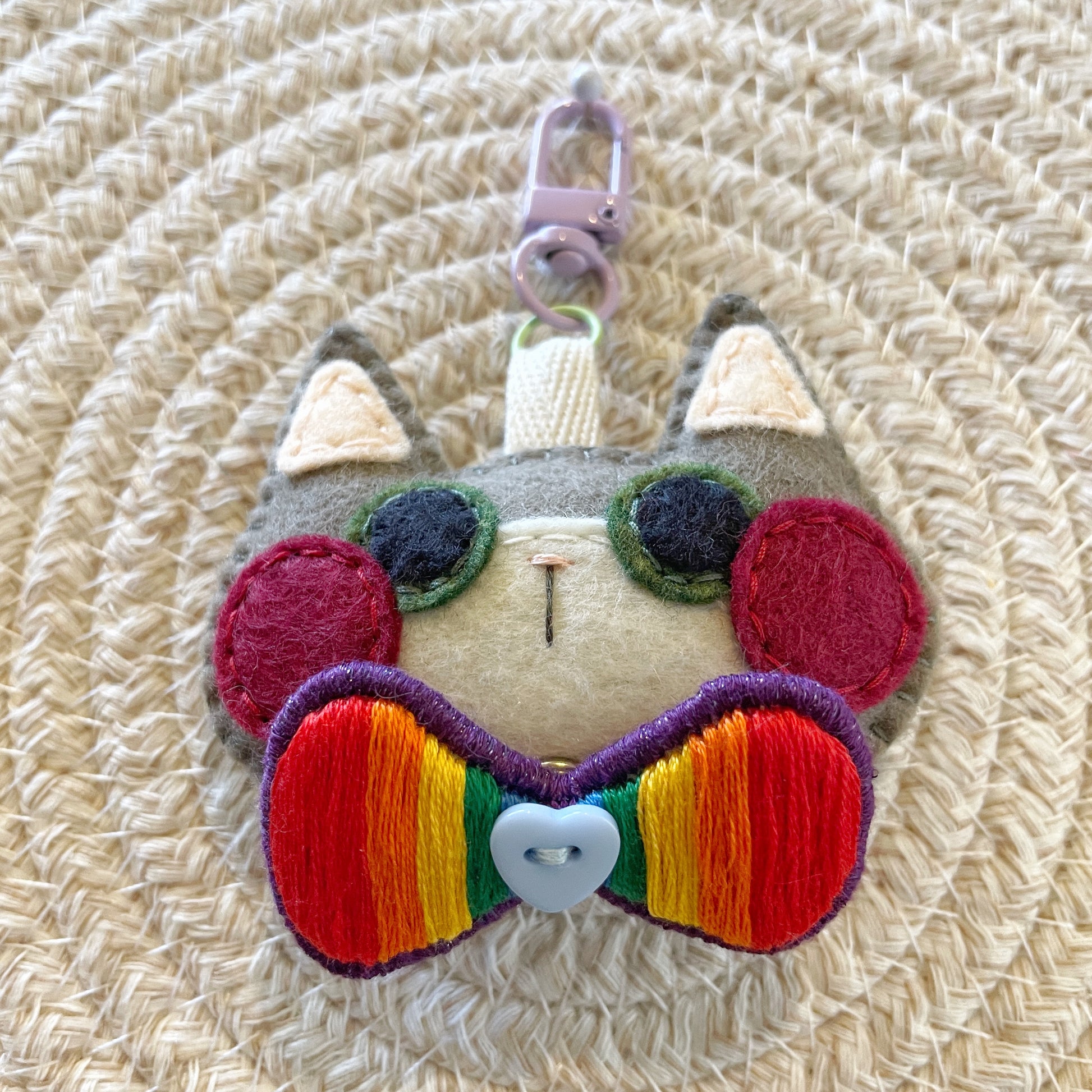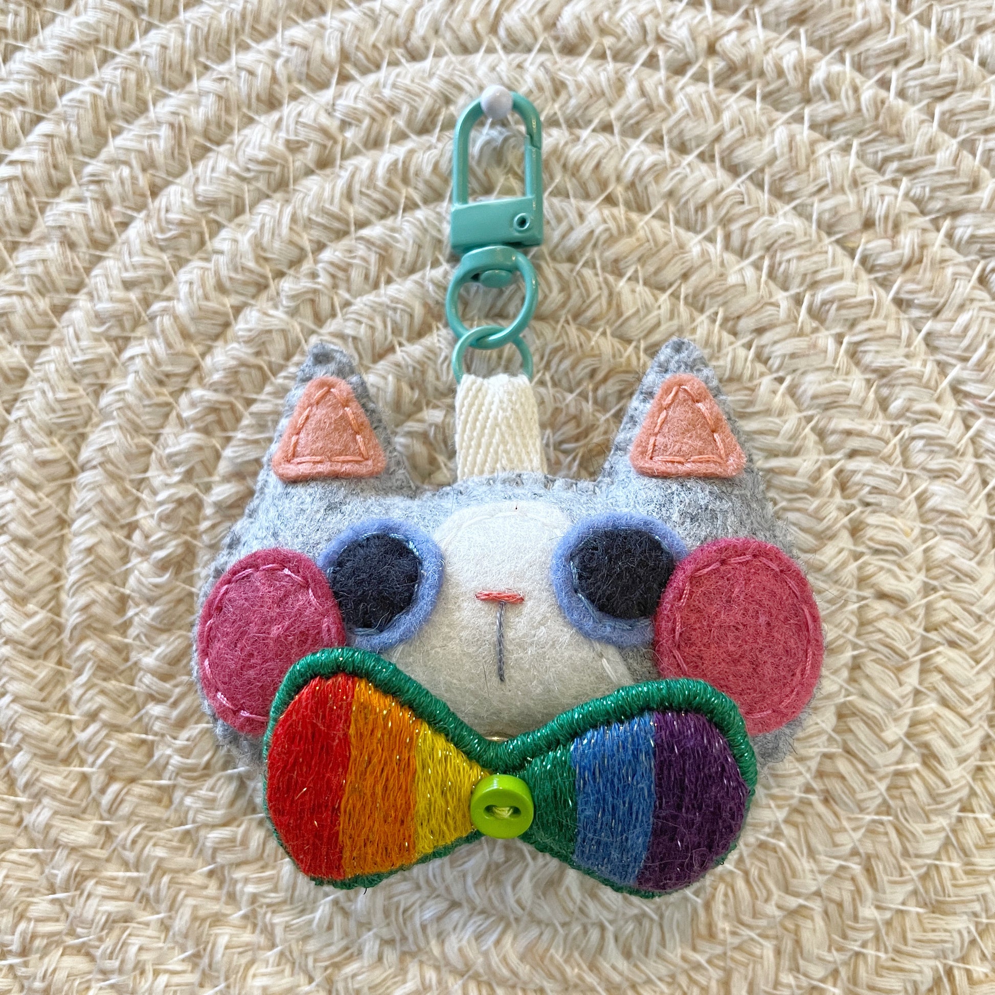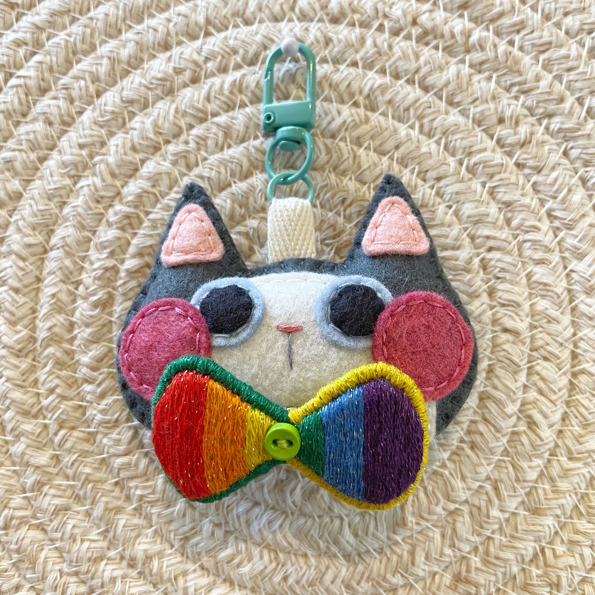 - Handmade felt plush keychain featuring a removable Pride flag themed bow-tie.