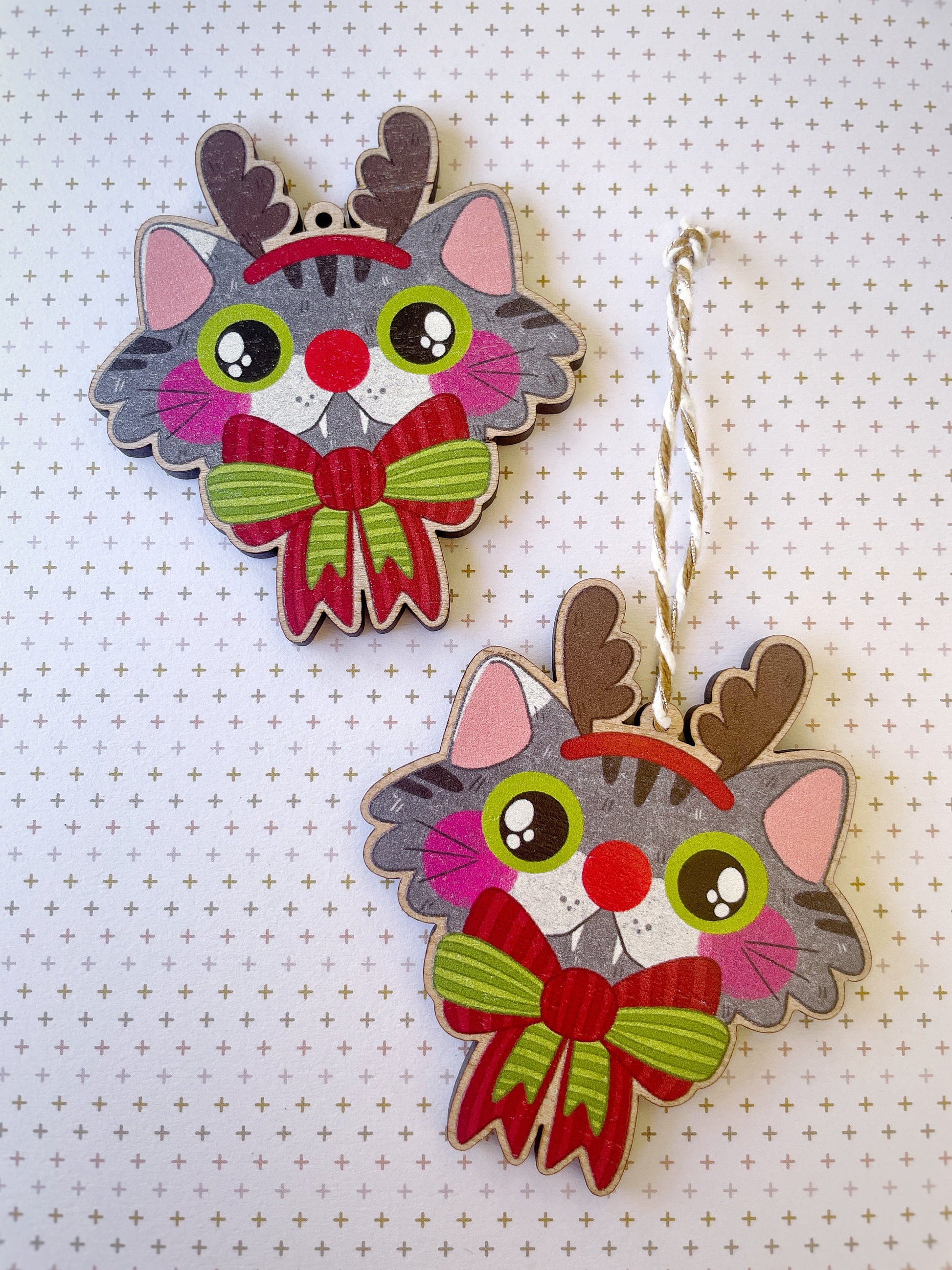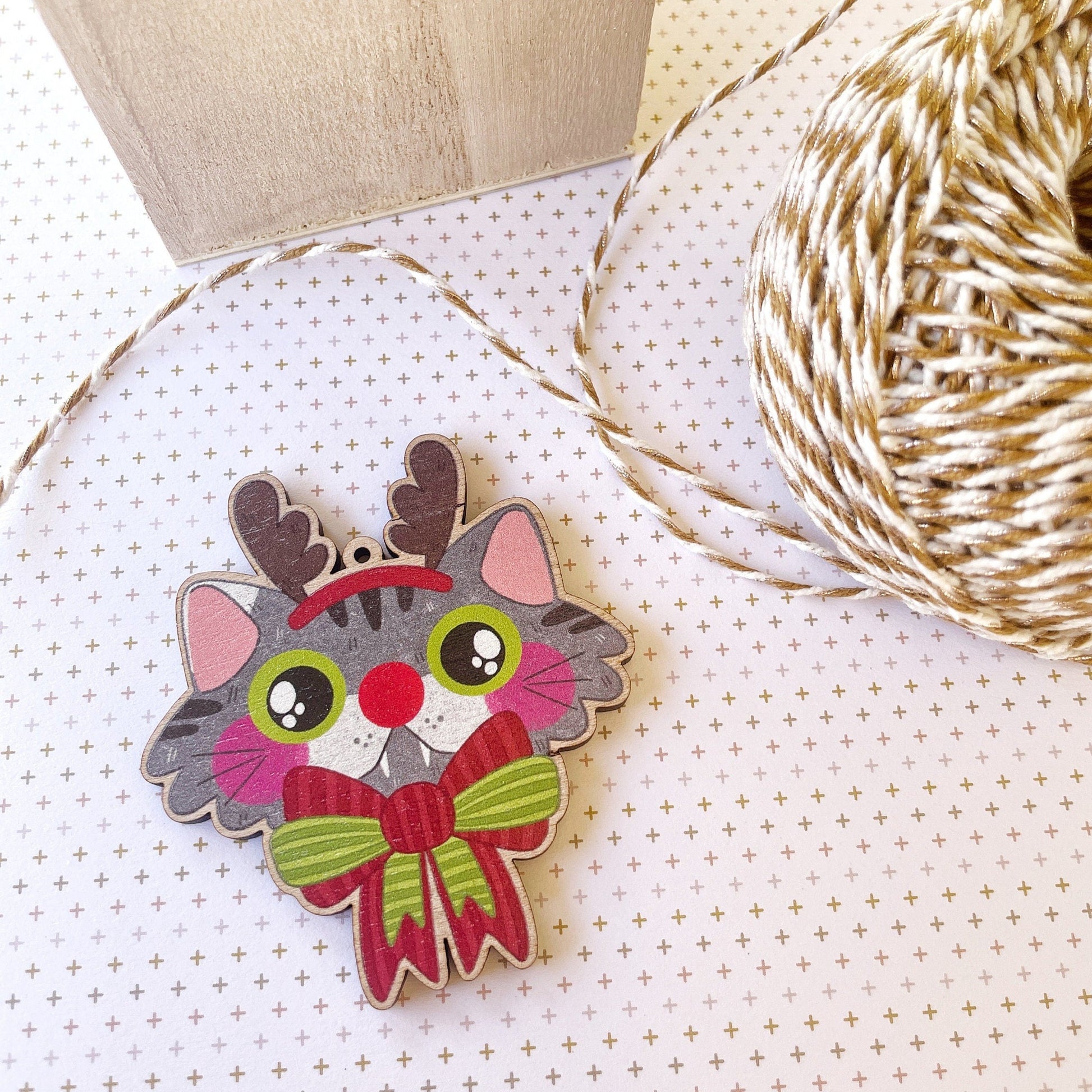 Red Nose Reindeer Cat Cherry Wood Ornament with String