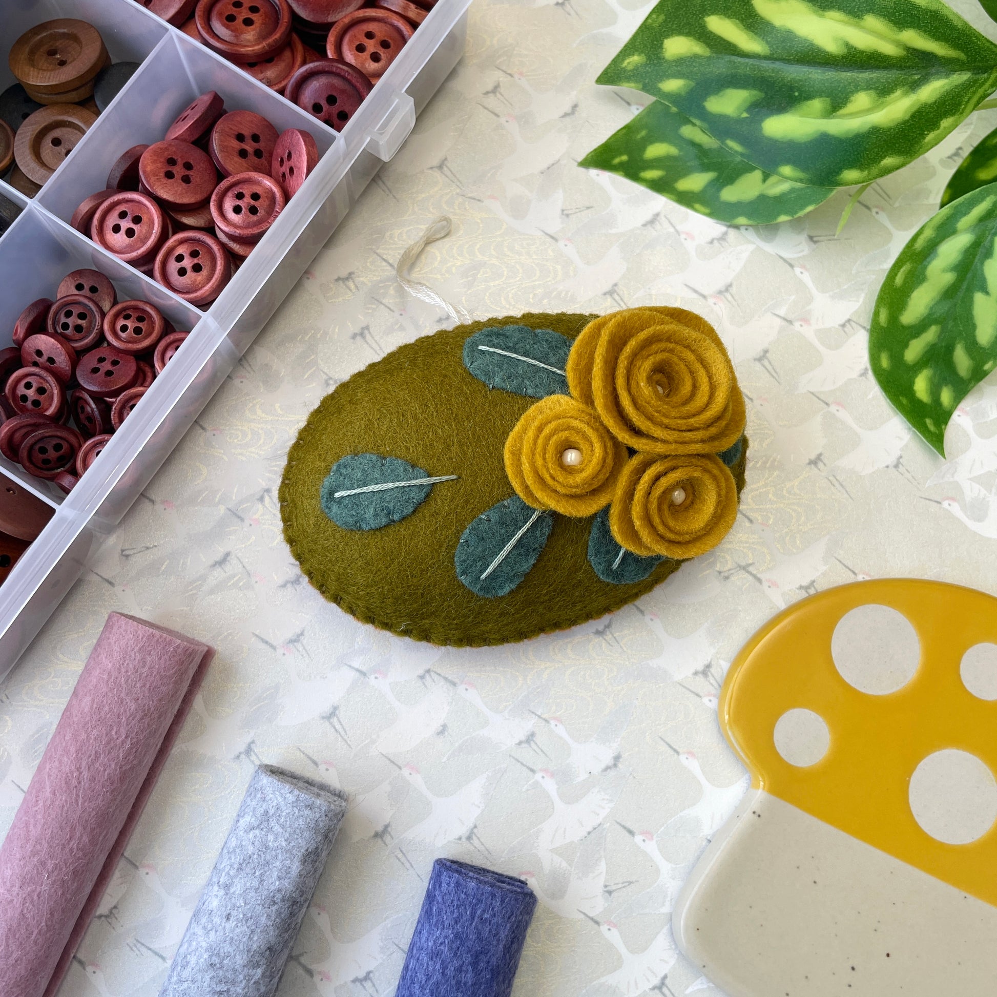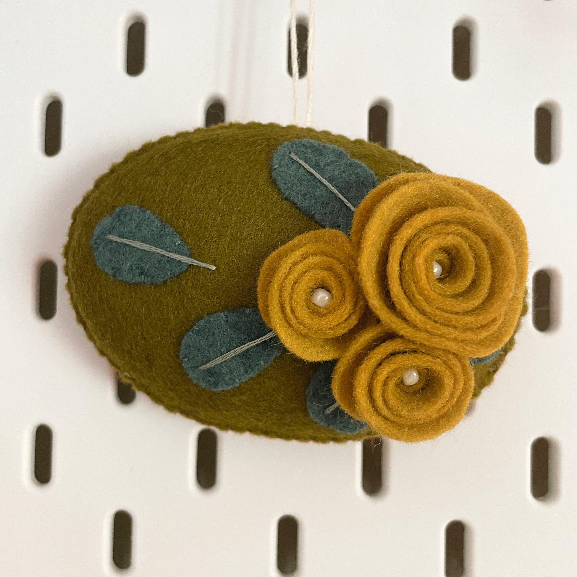 Handmade felt ornament with embroidery and beaded details. Ornament is stuffed with a fiber poly fill and finished with a blanket stitch. There is a loop stitched in for hanging or attaching a wire ornament hook.