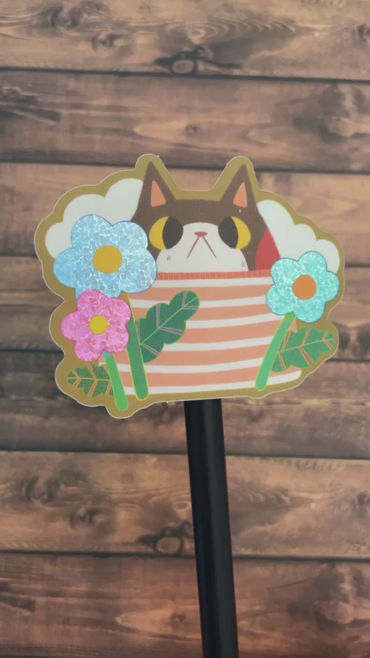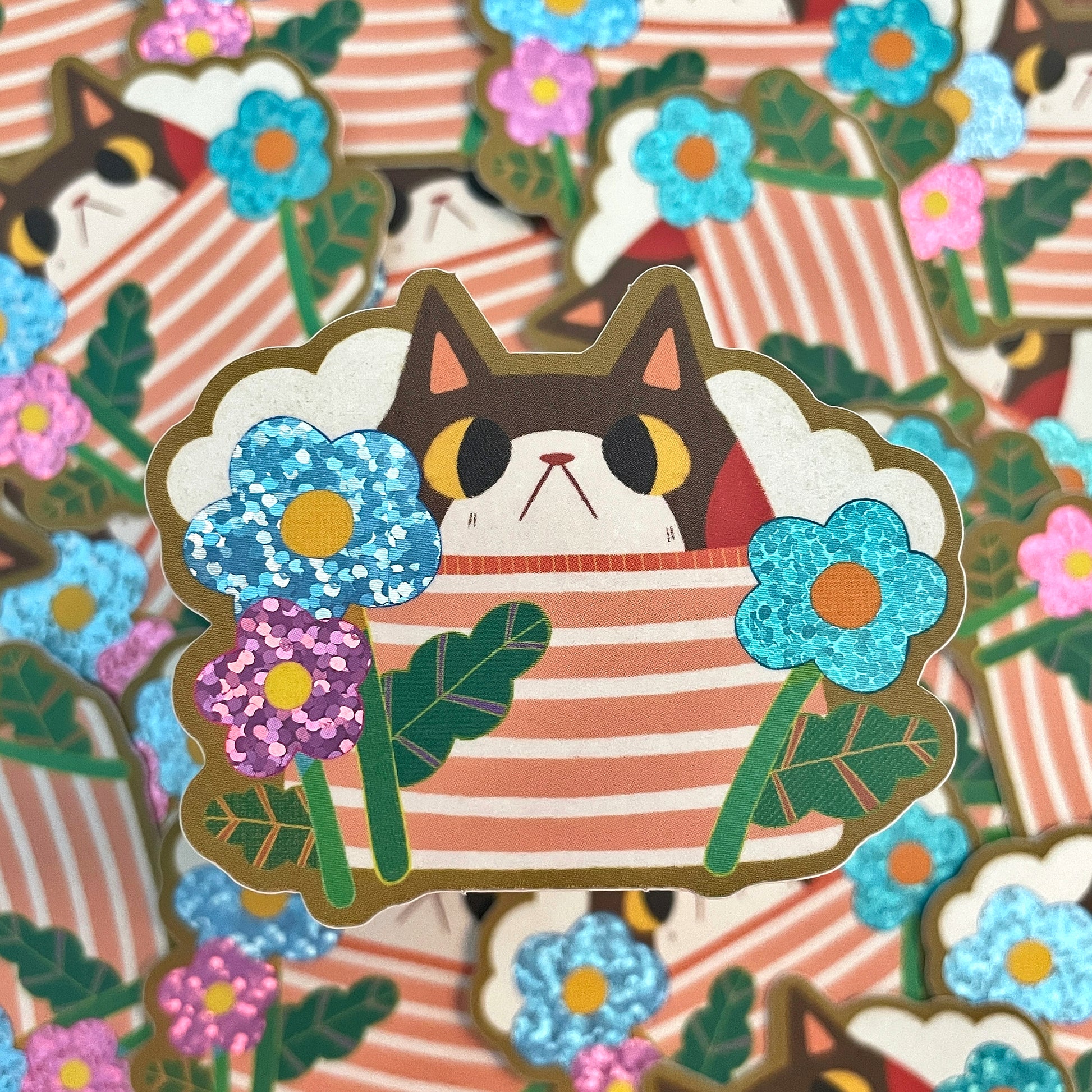 Brown and White Cat with Flowers Glitter Matte Die-cut Sticker